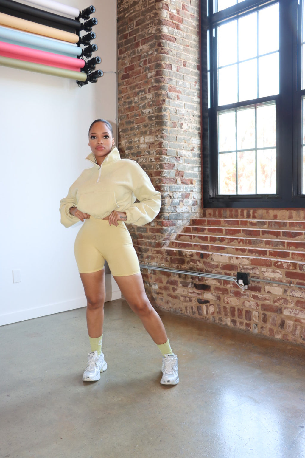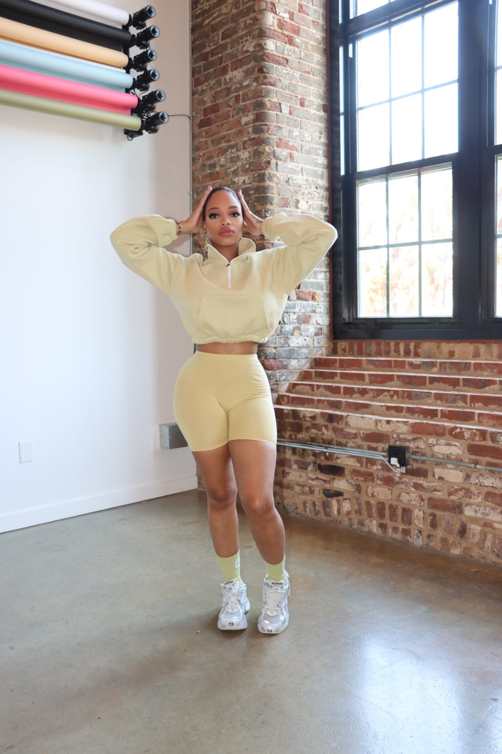 Half zip long sleeve cropped fleece with exaggerated collar and super charged waist cinching effect. Model wearing a medium. Runs Small .